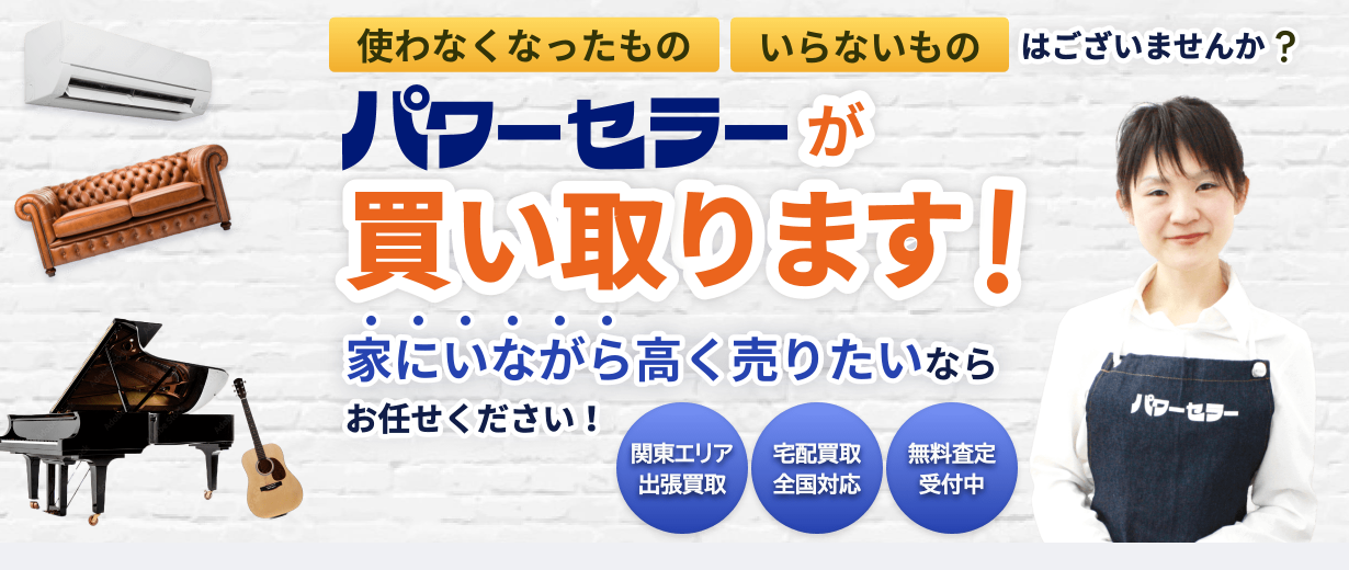 出張買取のパワーセラーは、家電、家具、楽器、オーディオ、健康器具、治療器、電動工具、カー用品、スポーツ・アウトドア用品、厨房機器、オフィス用品といった幅広い品目の買取に対応しています。特に、他社では引き取りを断られがちな大型の家具や家電、重量物も喜んで査定します。重くて運び出しが大変なものでも、専門スタッフが対応するのでご安心ください。1都3県(東京都、神奈川県、埼玉県、千葉県)をカバーする多数のドライバーが、1日に約50件のお客様宅を訪問しているため、お客様のご都合に合わせて迅速に駆けつけます。急なご依頼でも、すぐに査定に伺うことが可能です。