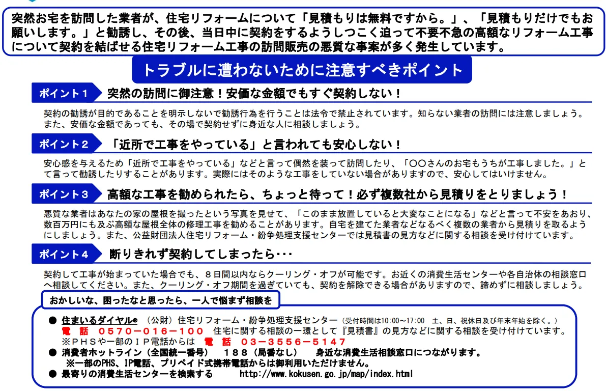 国民生活センターは、複数事業者から見積りを取る、相見積もりを勧めています。